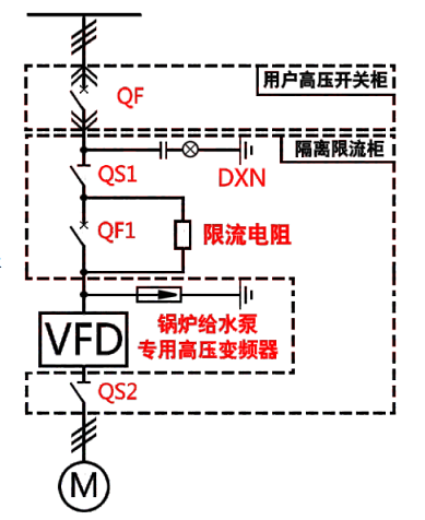 此方案為一拖一的典型方案,QS1、QS2為隔離開關(guān)。系統(tǒng)高壓上電時,電流首先通過限流電阻對系統(tǒng)進行充電,當(dāng)系統(tǒng)充電完畢后斷路器QF1自動動作,切除限流電阻,系統(tǒng)正常上電,整個高壓上電過程對系統(tǒng)無沖擊,有效的提高了設(shè)備使用的穩(wěn)定性及設(shè)備的使用壽命。