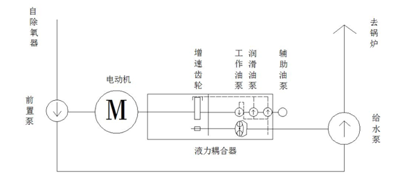 系統(tǒng)由前置泵、電動(dòng)機(jī)、液力偶合器(包含工作油路、潤滑油路部分)、給水泵組成,系統(tǒng)根據(jù)機(jī)組負(fù)荷變化,通過液力偶合器調(diào)節(jié)給水泵供水量的大小,以滿足鍋爐生產(chǎn)系統(tǒng)供水量的需要。